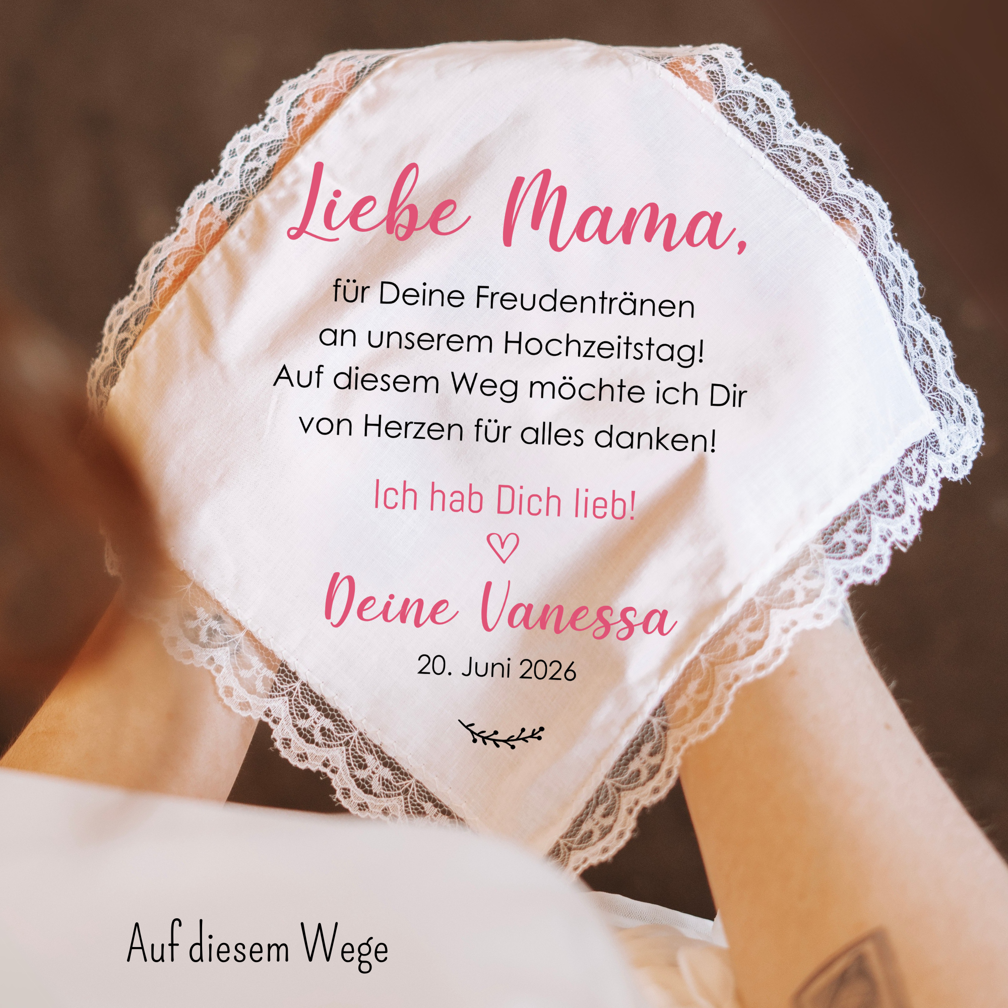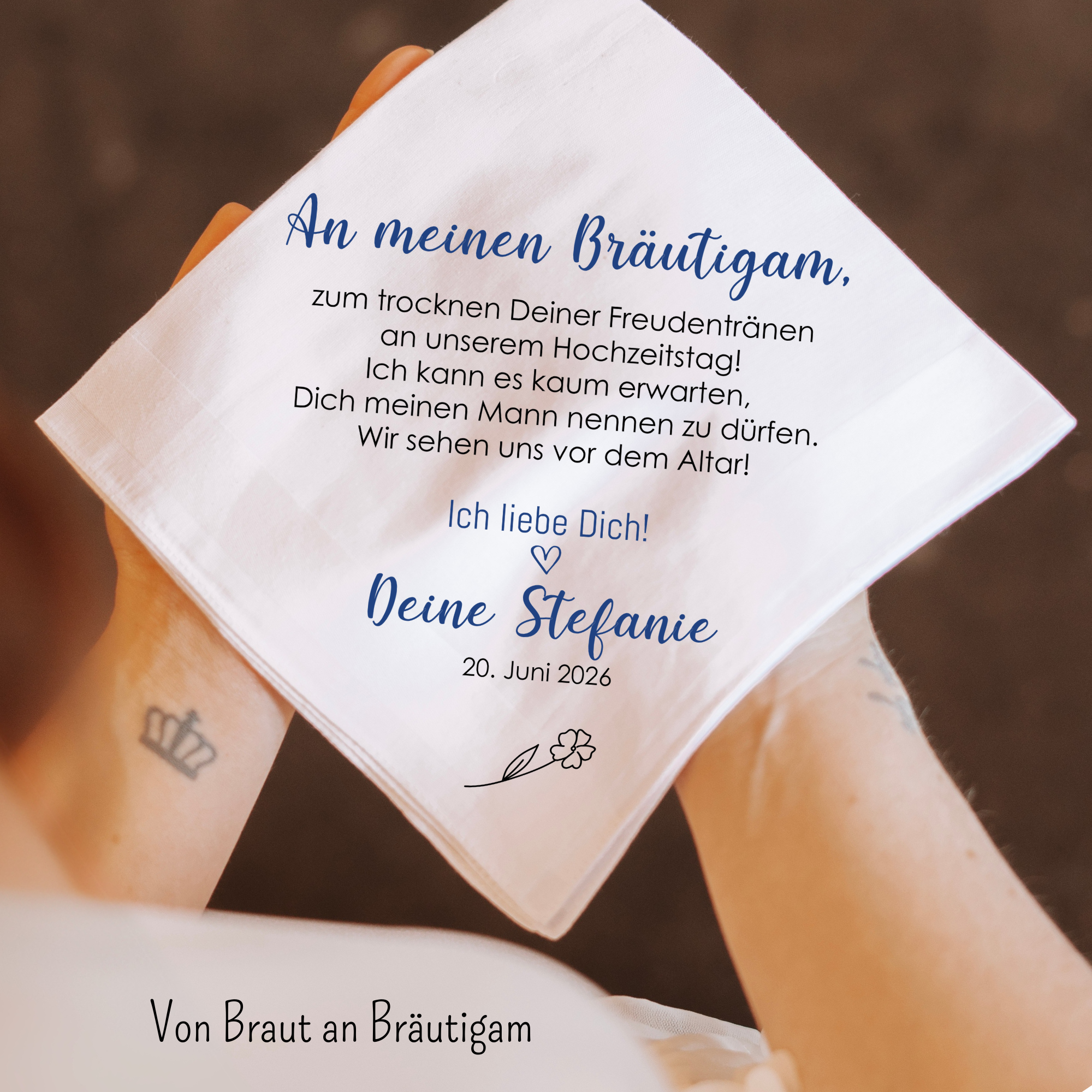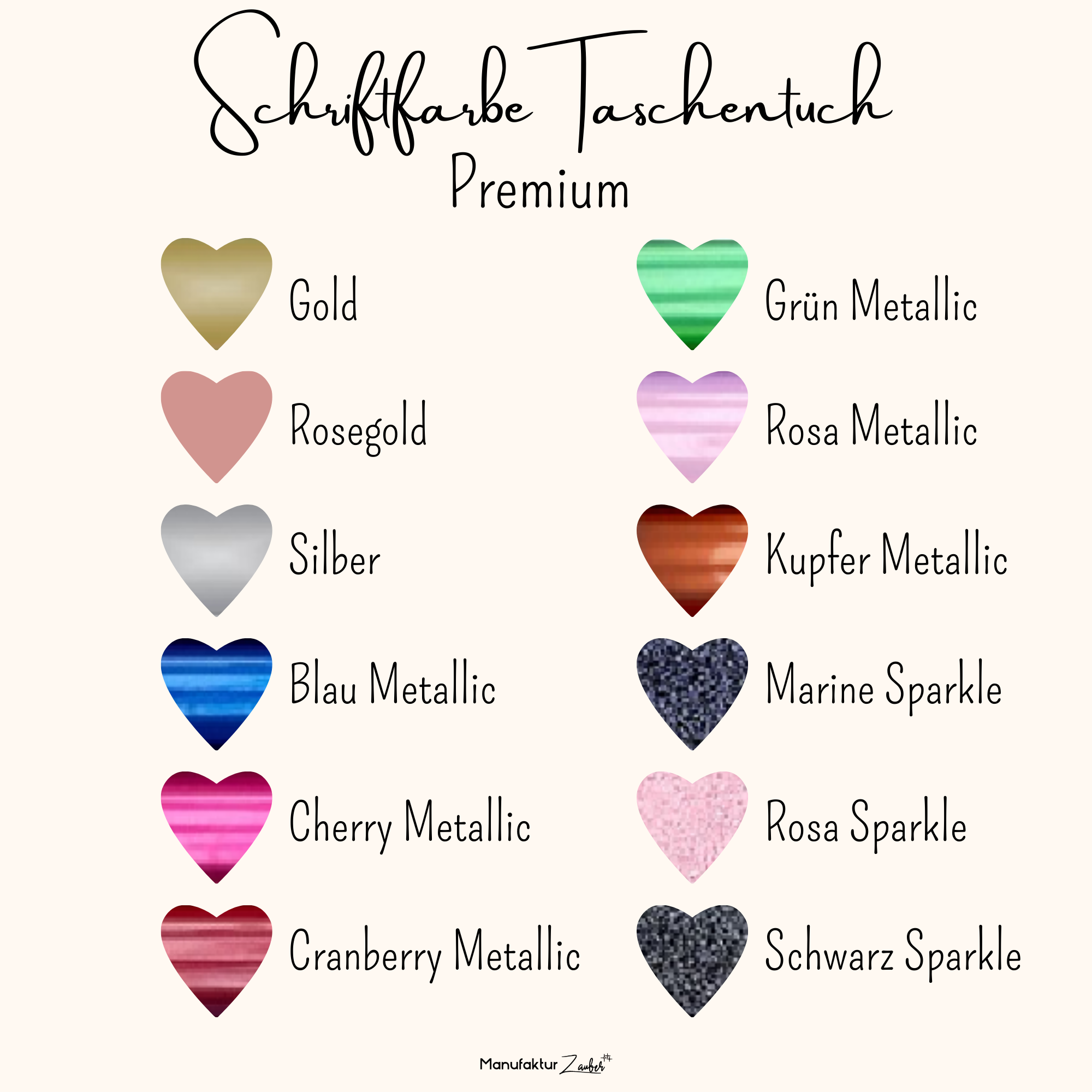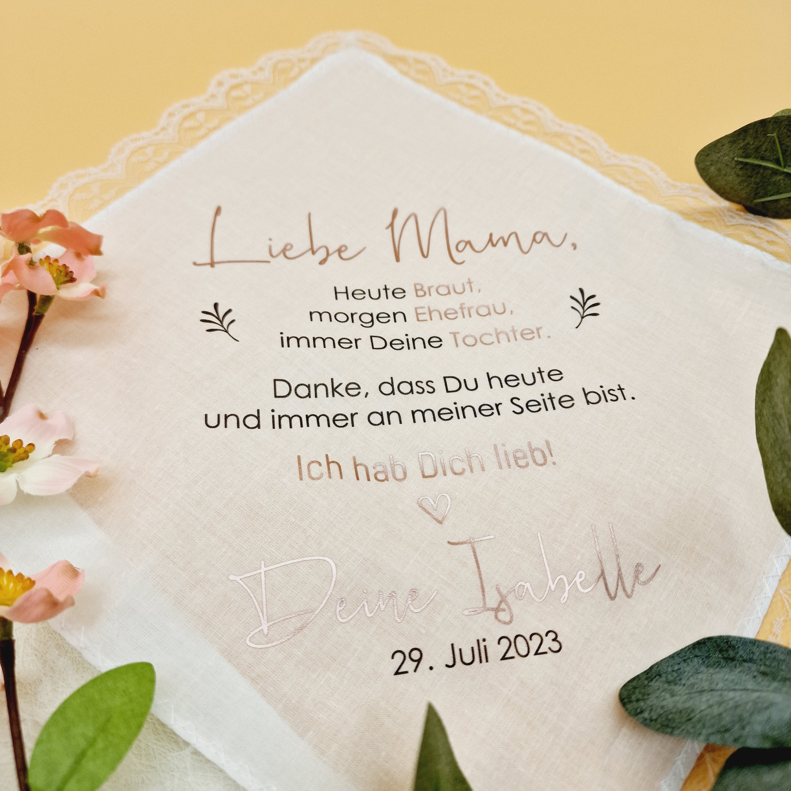 Jedes Taschentuch kann mit individueller Anrede und persönlicher Grußformel personalisiert werden – in edlen Folienfarben, die eure Worte stilvoll hervorheben.