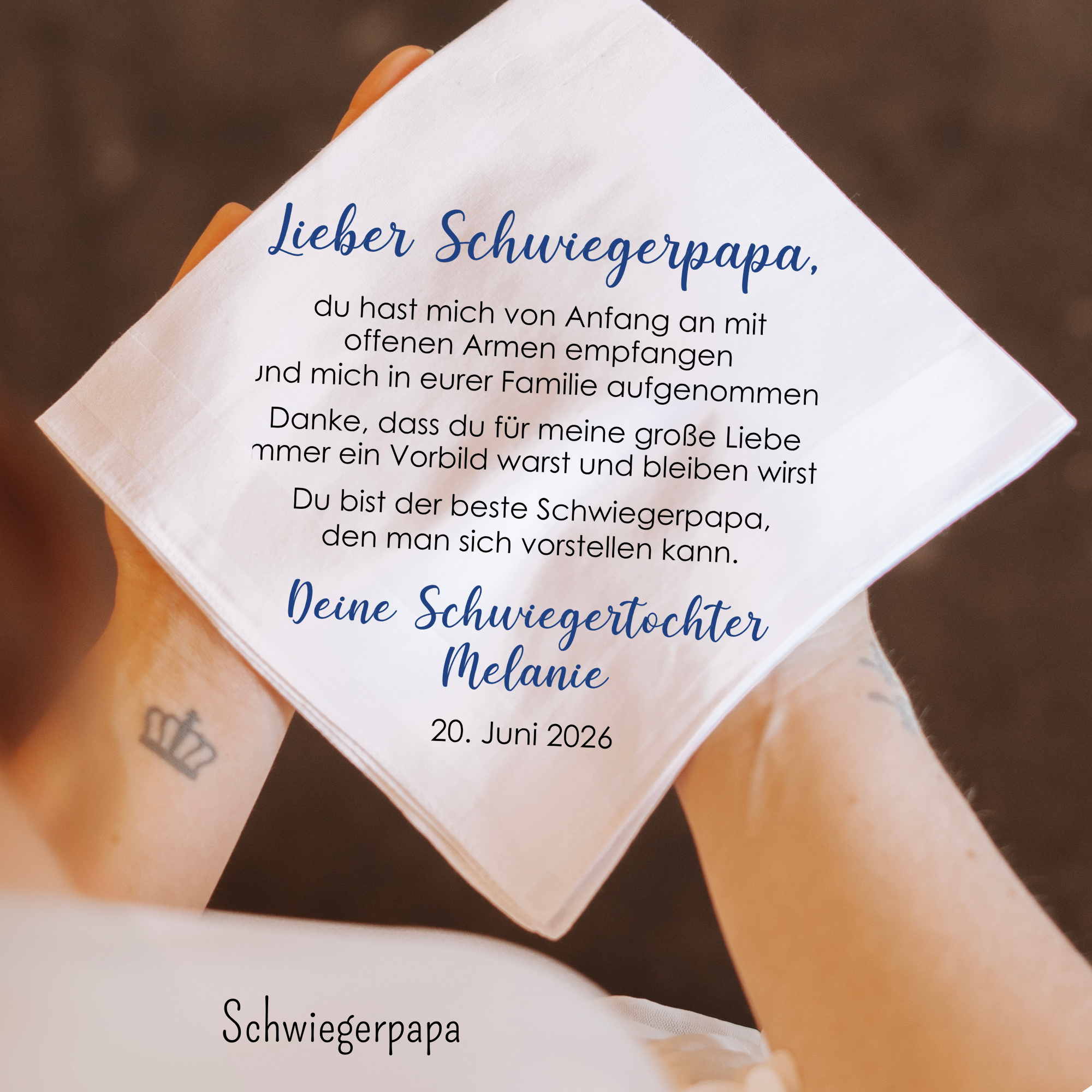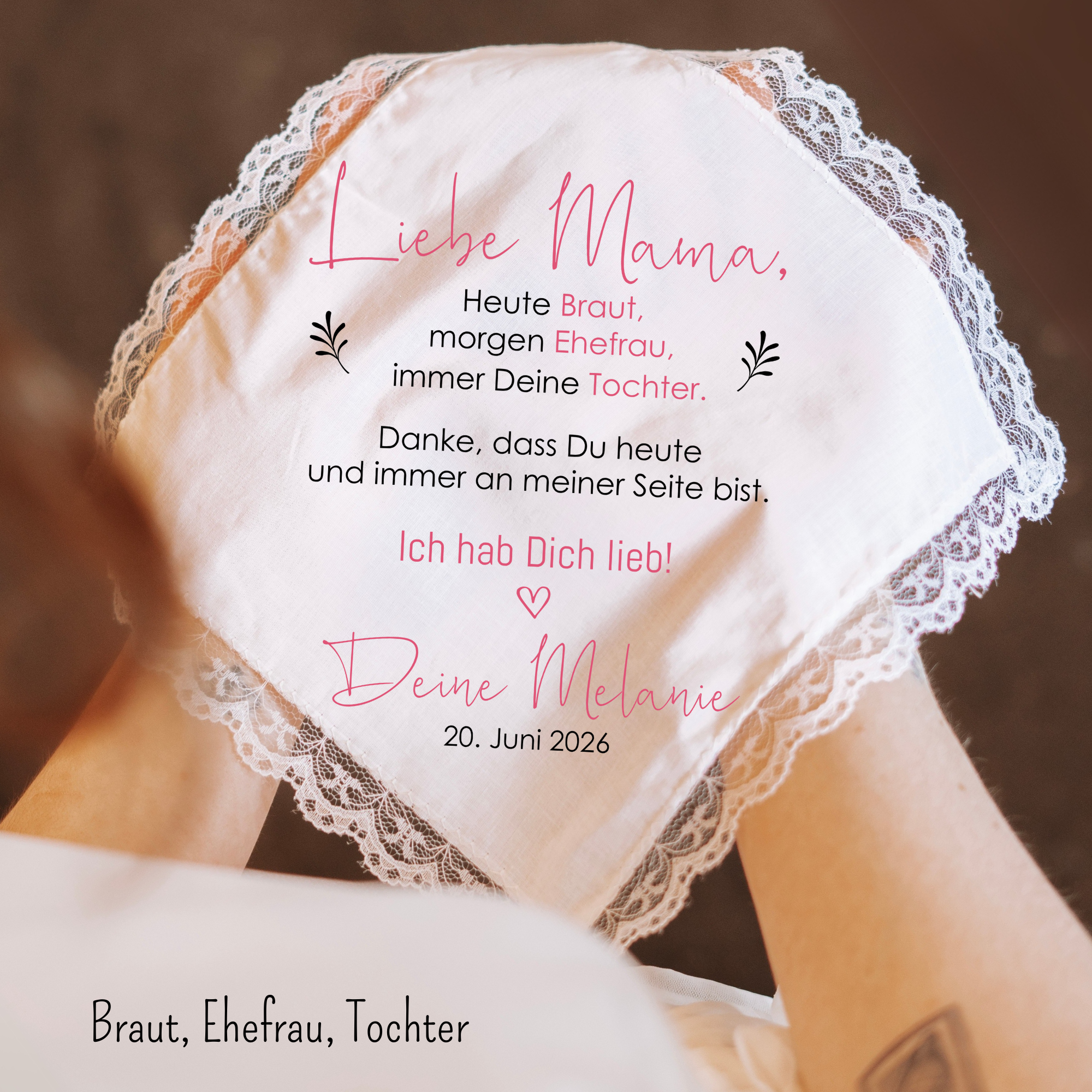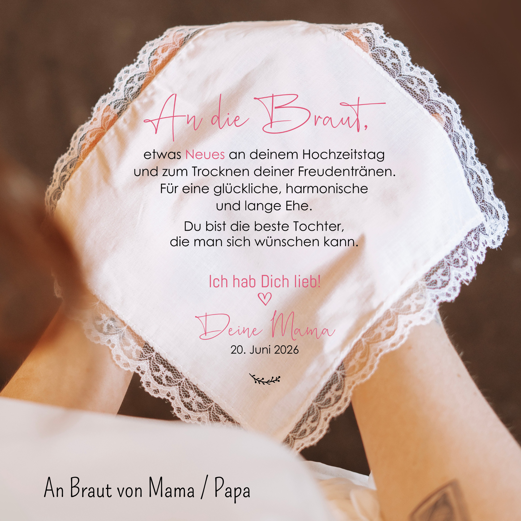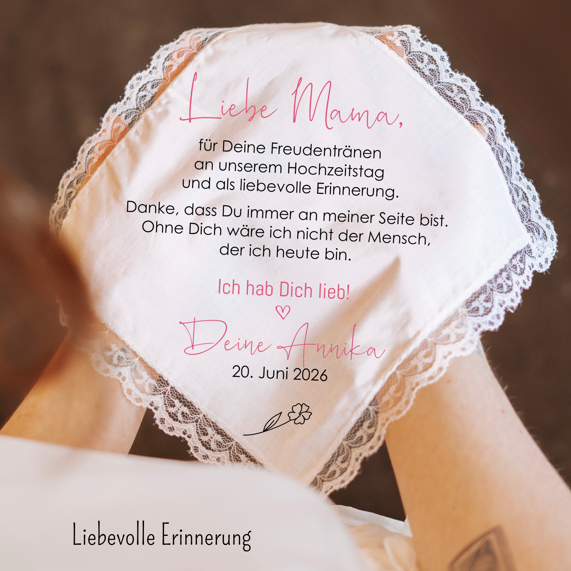 Jedes Taschentuch kann mit individueller Anrede und persönlicher Grußformel personalisiert werden – in edlen Folienfarben, die eure Worte stilvoll hervorheben.