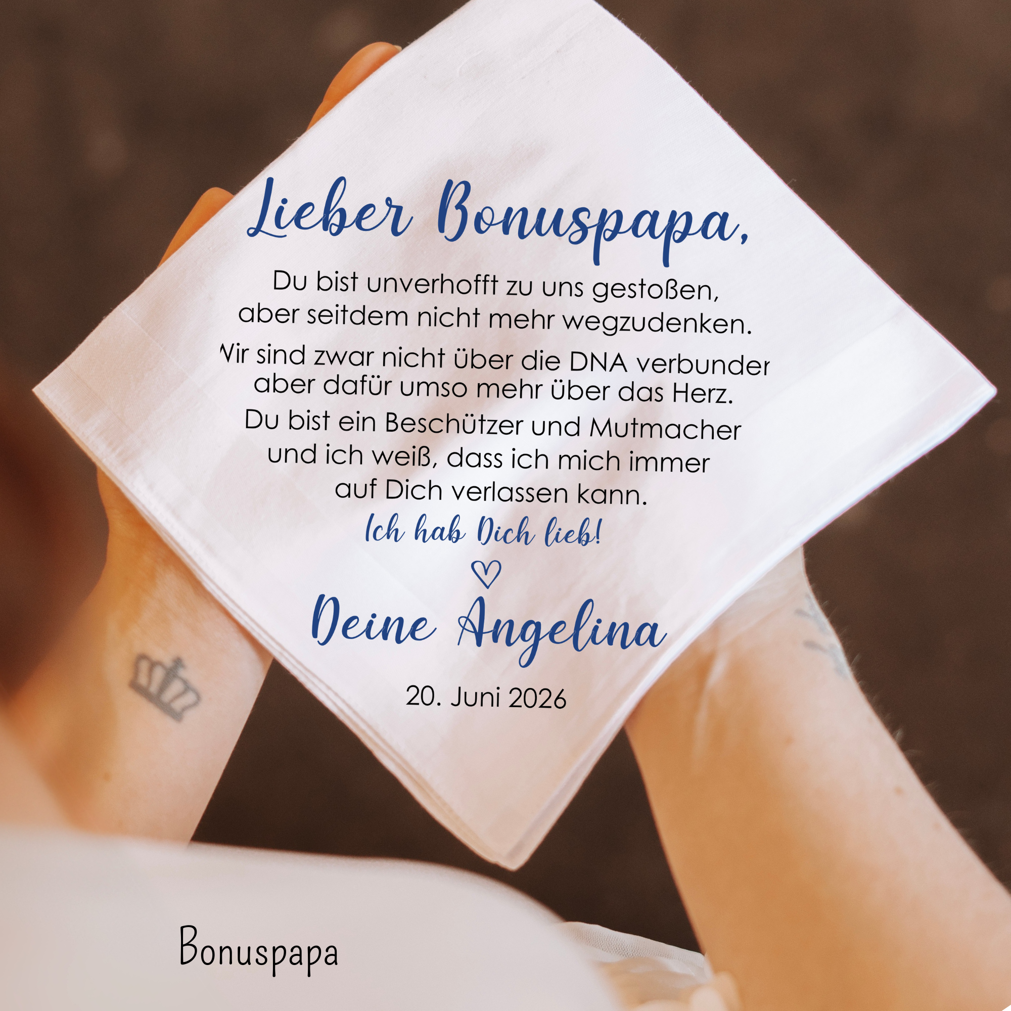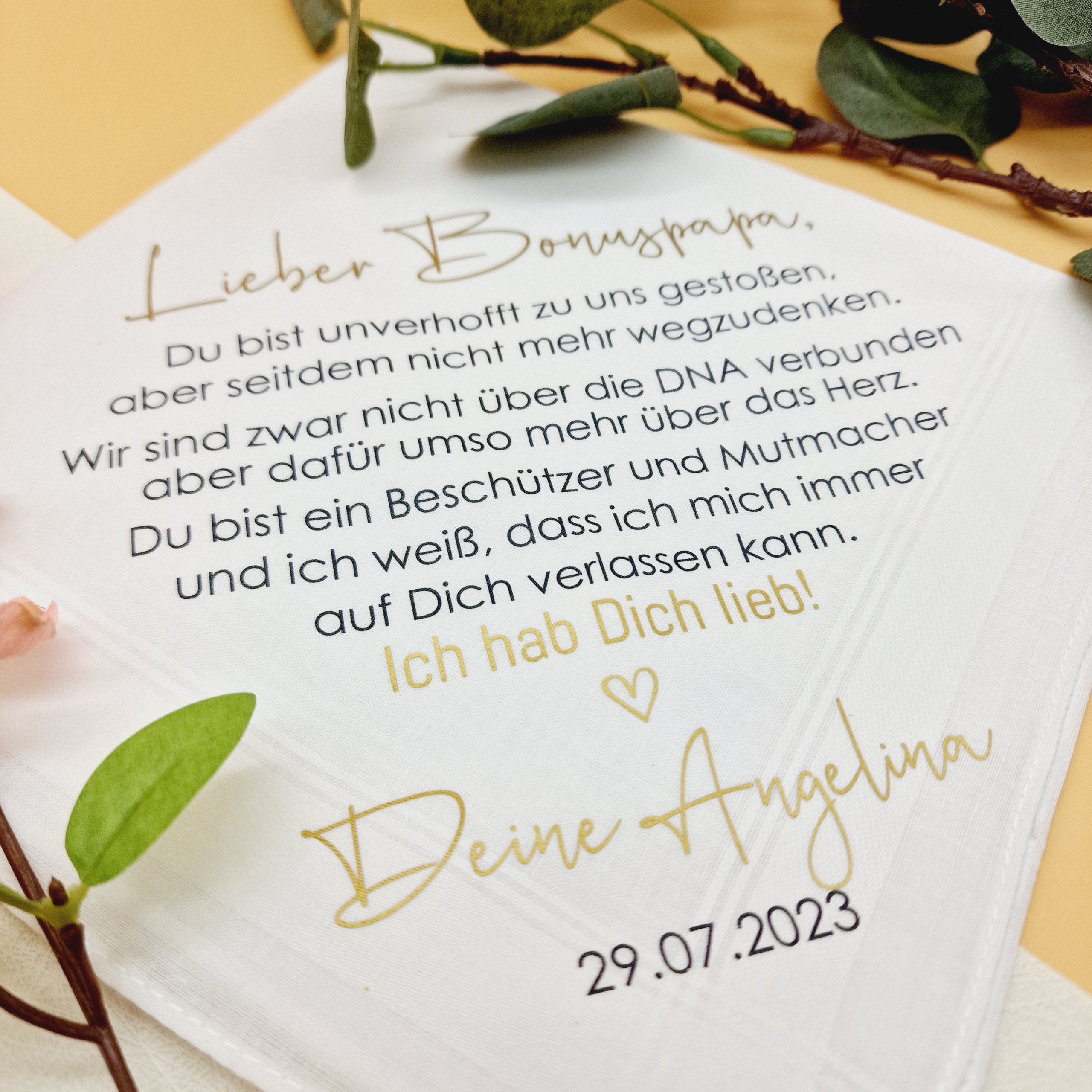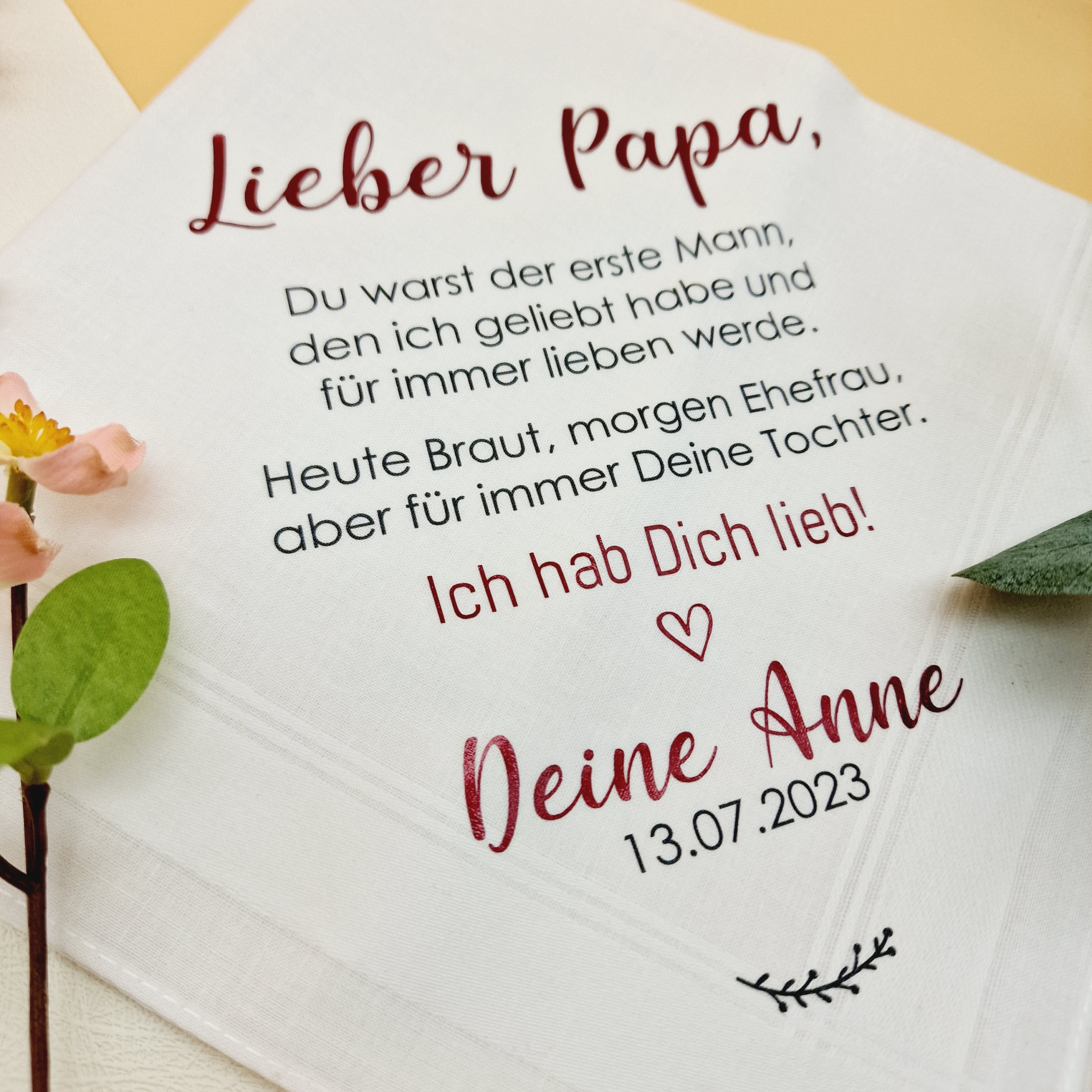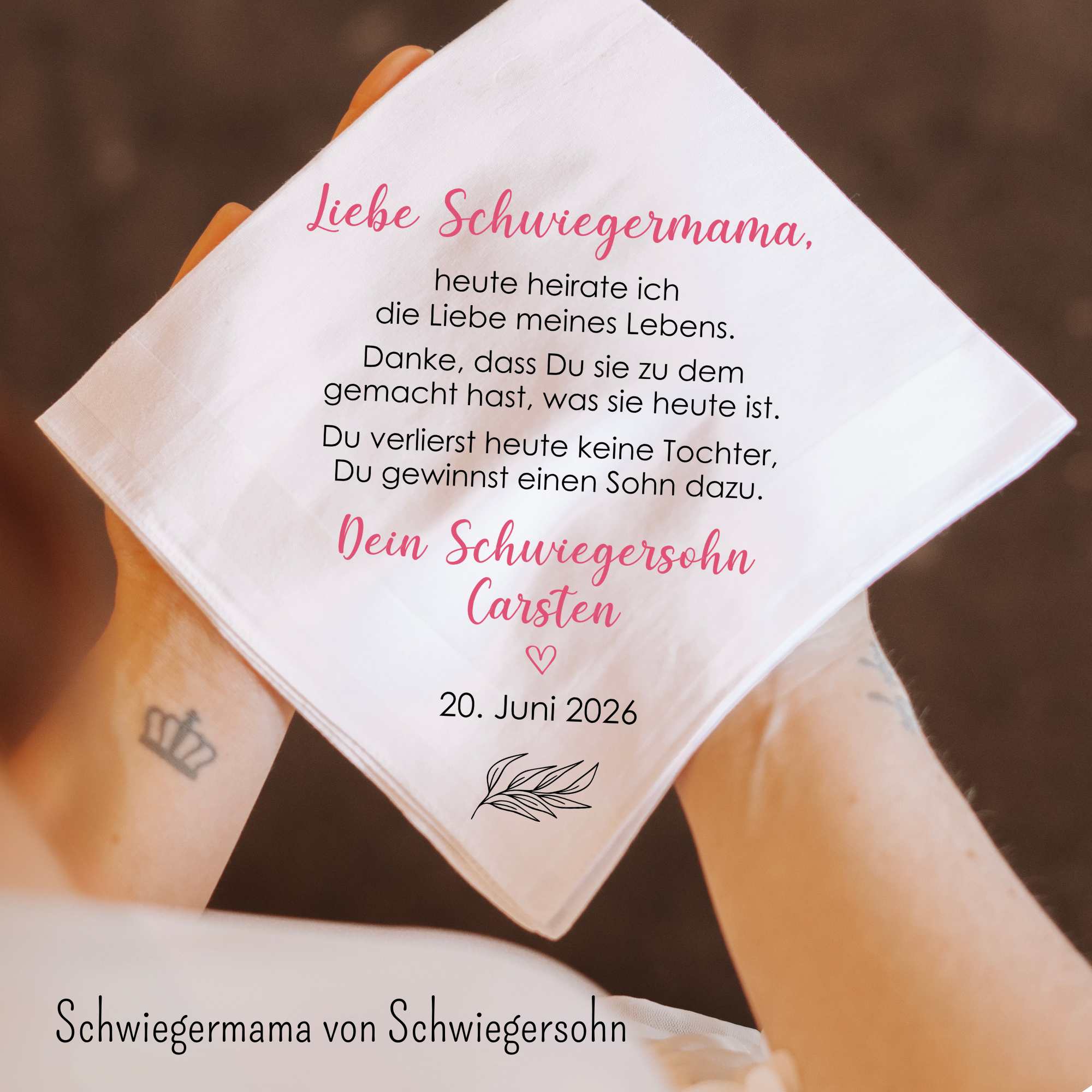 Jedes Taschentuch kann mit individueller Anrede und persönlicher Grußformel personalisiert werden – in edlen Folienfarben, die eure Worte stilvoll hervorheben.