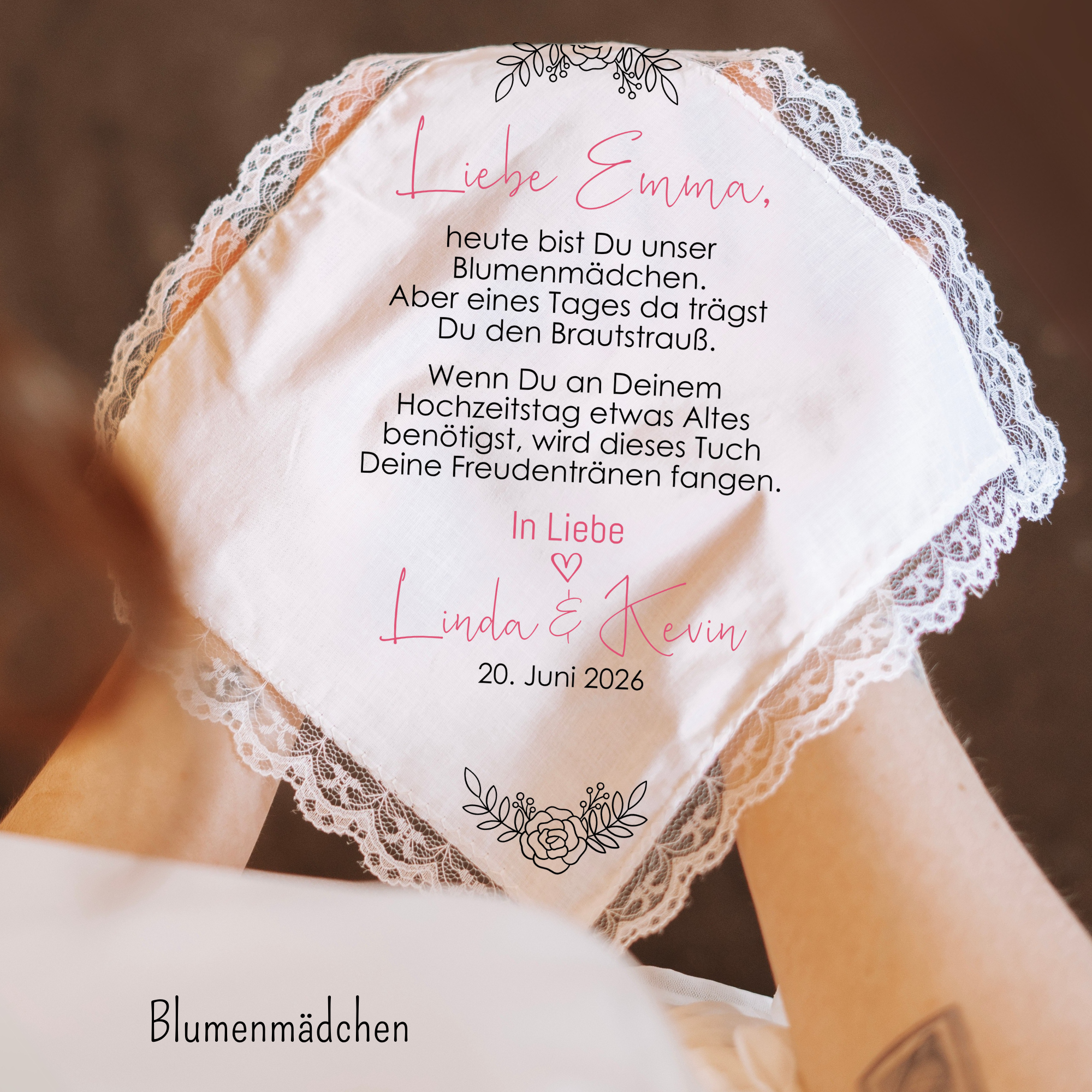 Taschentuch mit Spitze unten: Maße ca. 20x20cm, ausgebreitet ist es ca 43x43cm – Wird im gefalteten Zustand bedruckt
