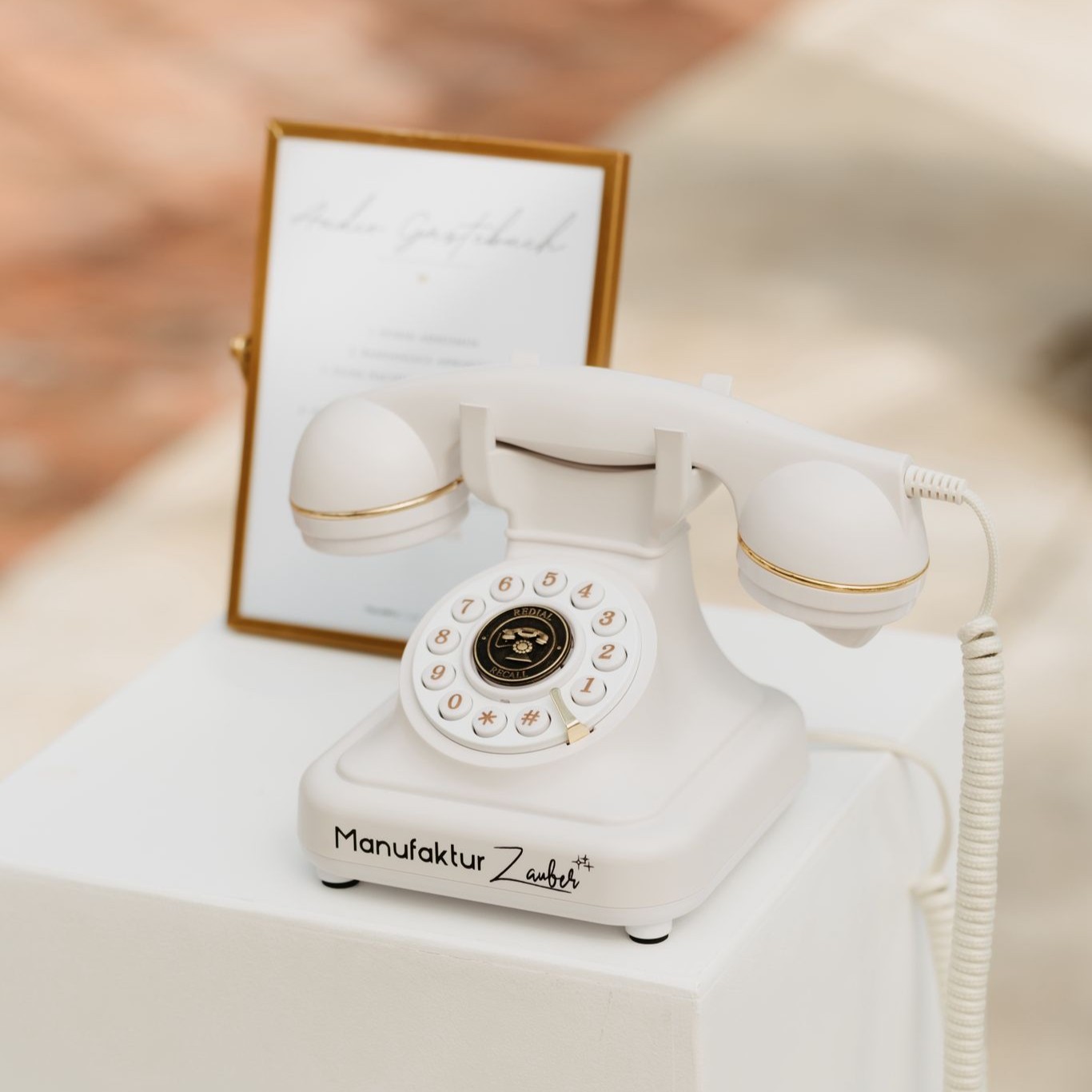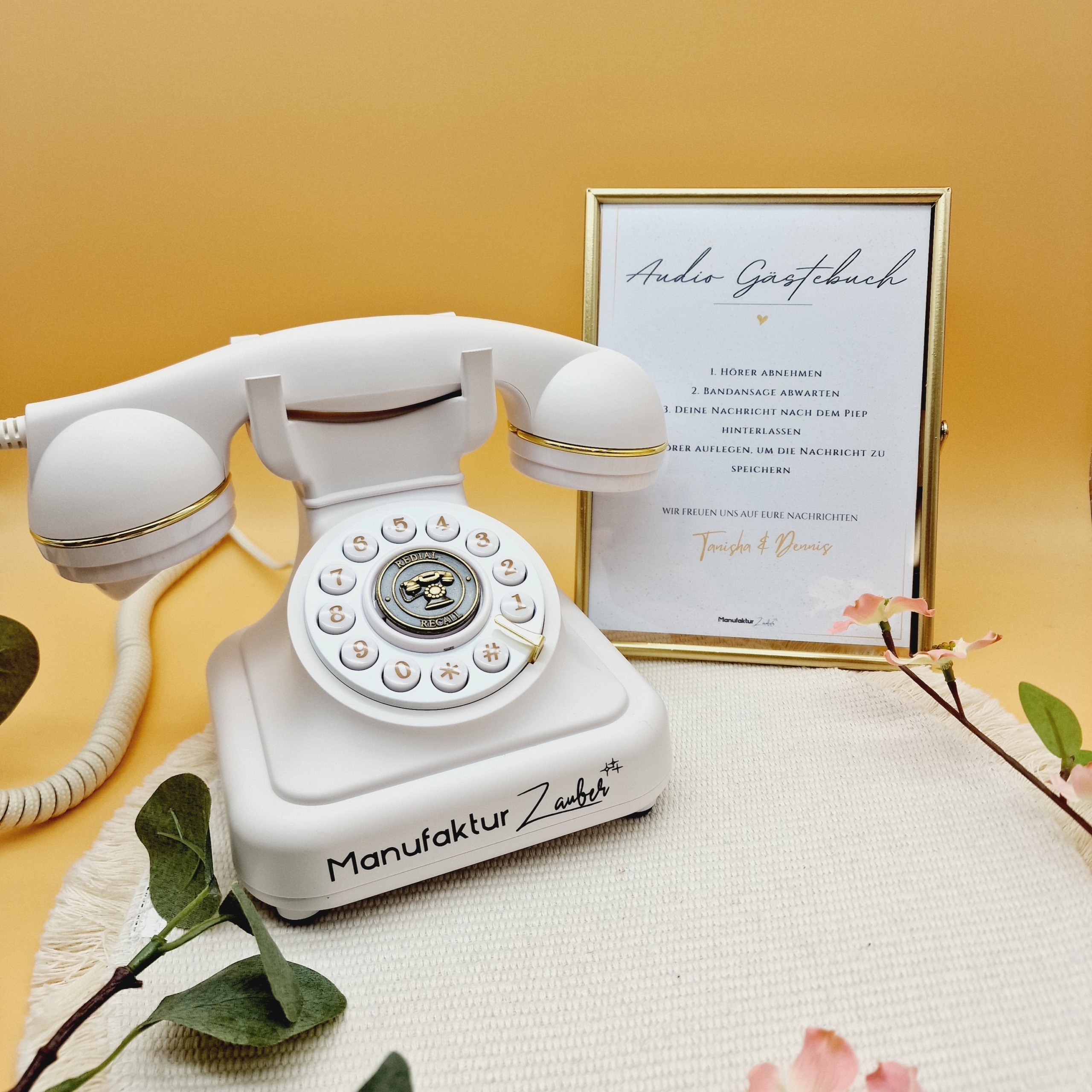 A: Das ist ein Telefon, hier im Vintage-Design, auf welches eure Gäste Nachrichten und Glückwünsche für euch drauf sprechen können