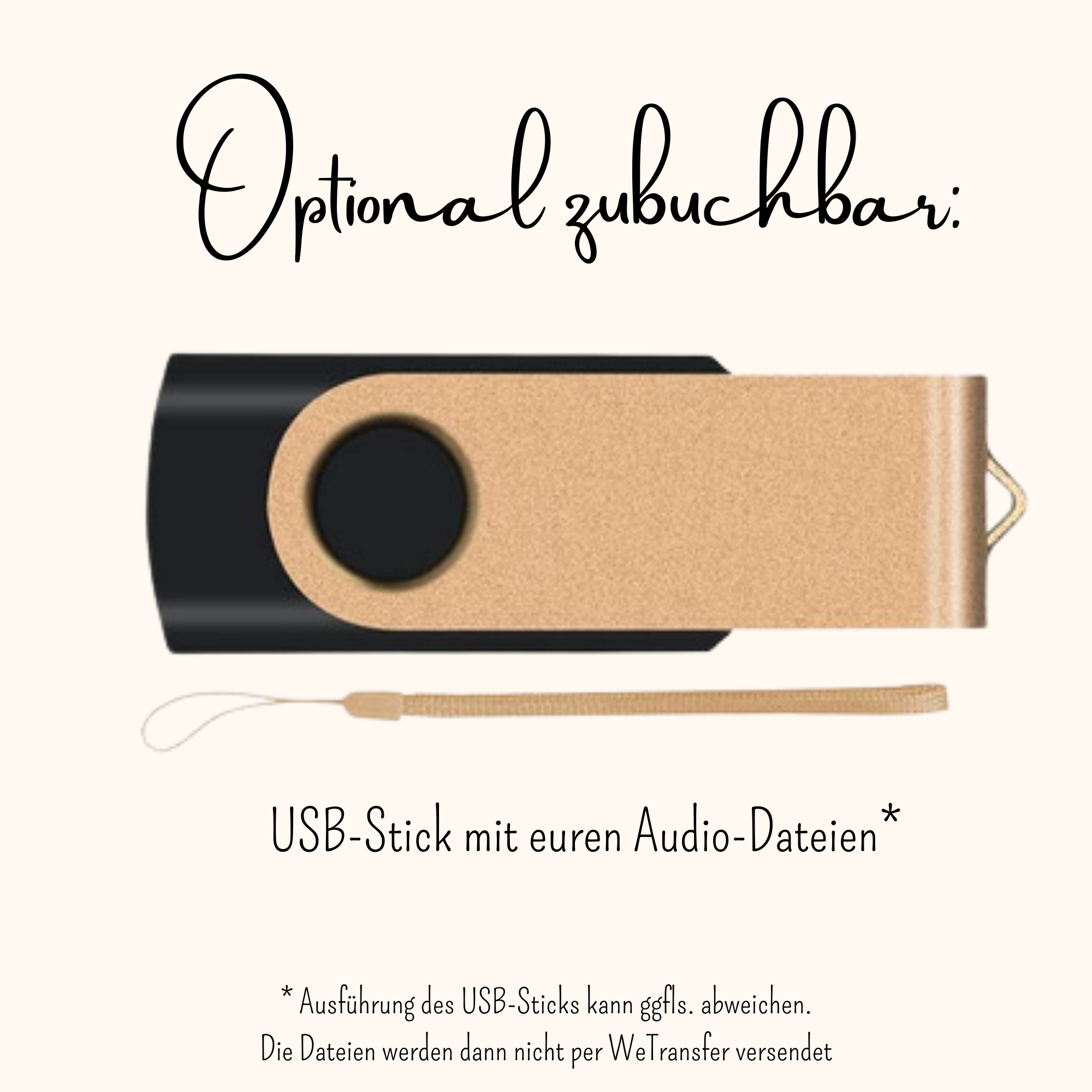 - Innerhalb 7 Tage nach Rücksendung des Telefons erhältst du alle Audio-Dateien digital per WeTransfer, oder gegen Aufpreis wird dir ein (personalisierter) USB-Stick per Post zugeschickt. In diesem Fall werden die Datein nicht im Vorfeld per WeTransfer versendet.