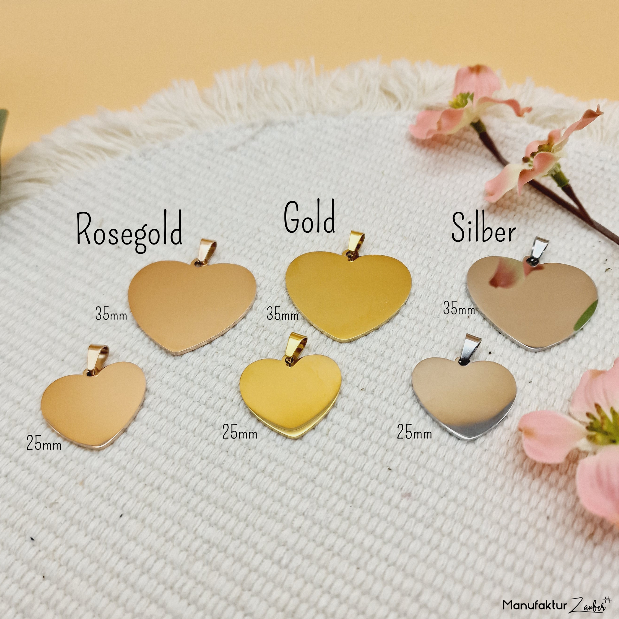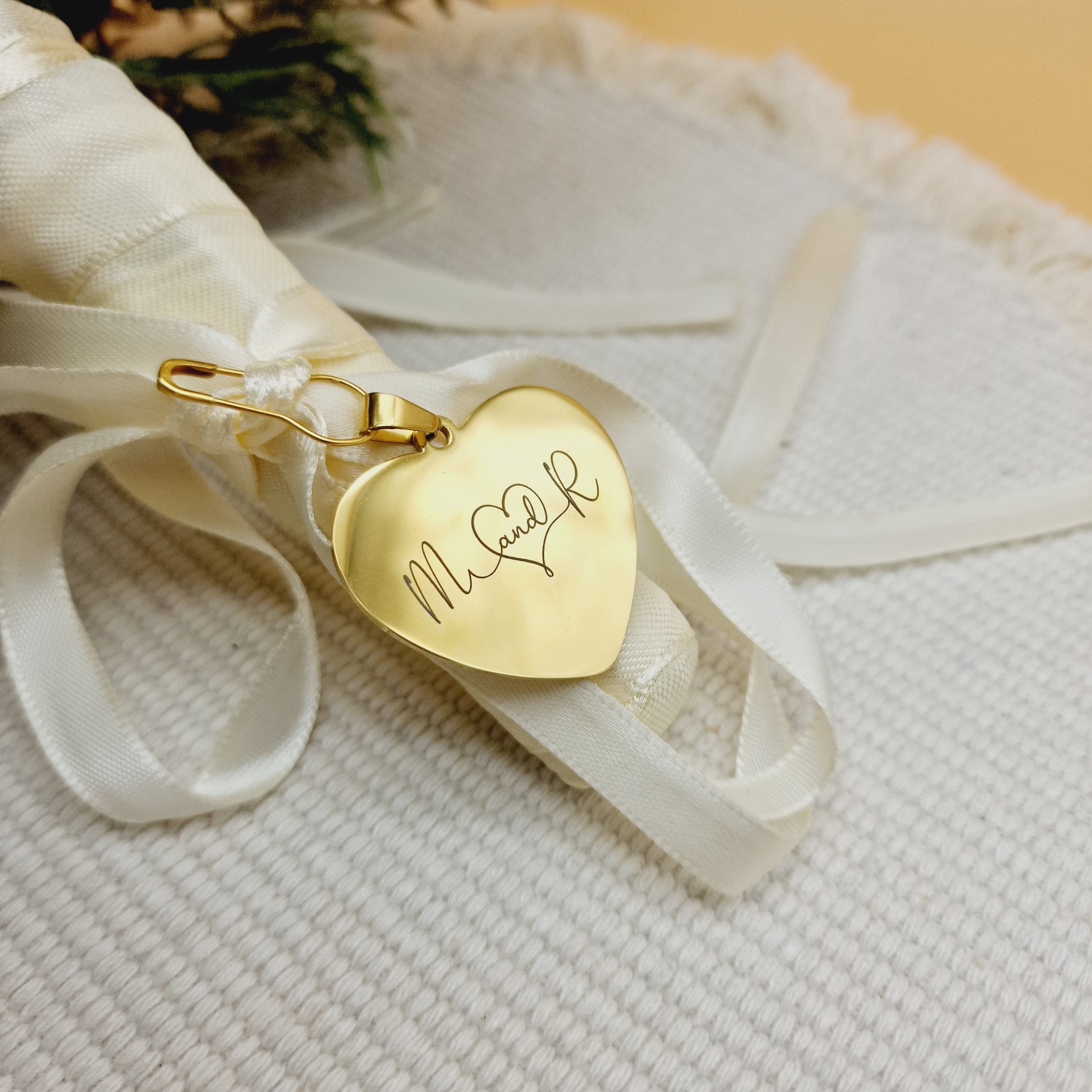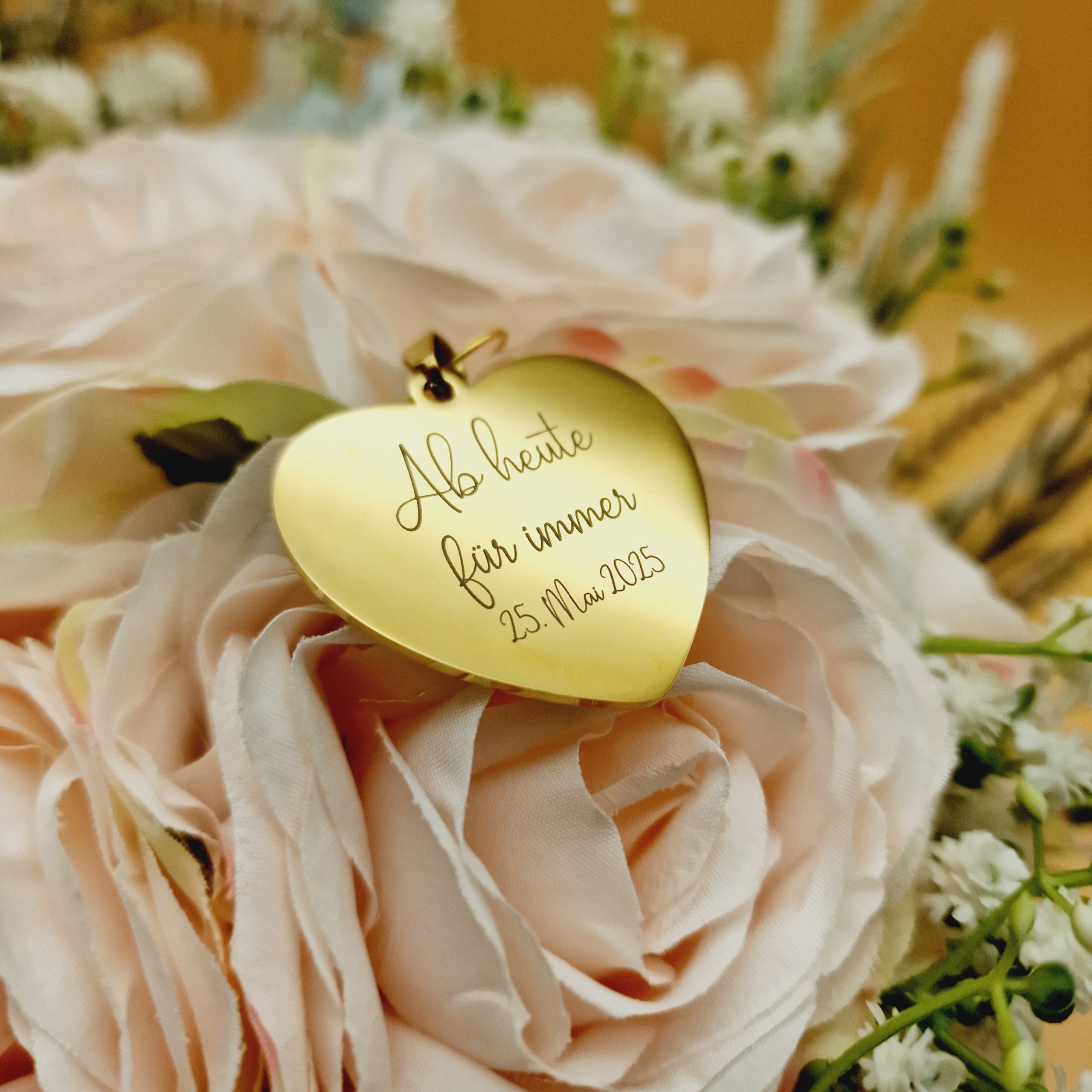 Ein Symbol der Liebe, das deine Hochzeit noch persönlicher macht. Der Anhänger kann mit deinem Wunschtext graviert werden – ob ein Name, ein Datum oder eine kleine Botschaft. Wähle zwischen den Größen 25 mm oder 35 mm und entscheide, ob du ihn einseitig oder zweiseitig gravieren lassen möchtest. Erhältlich ist er in Gold, Silber oder Roségold – passend zu deinem Brautstrauß und deinem Hochzeitsstil.