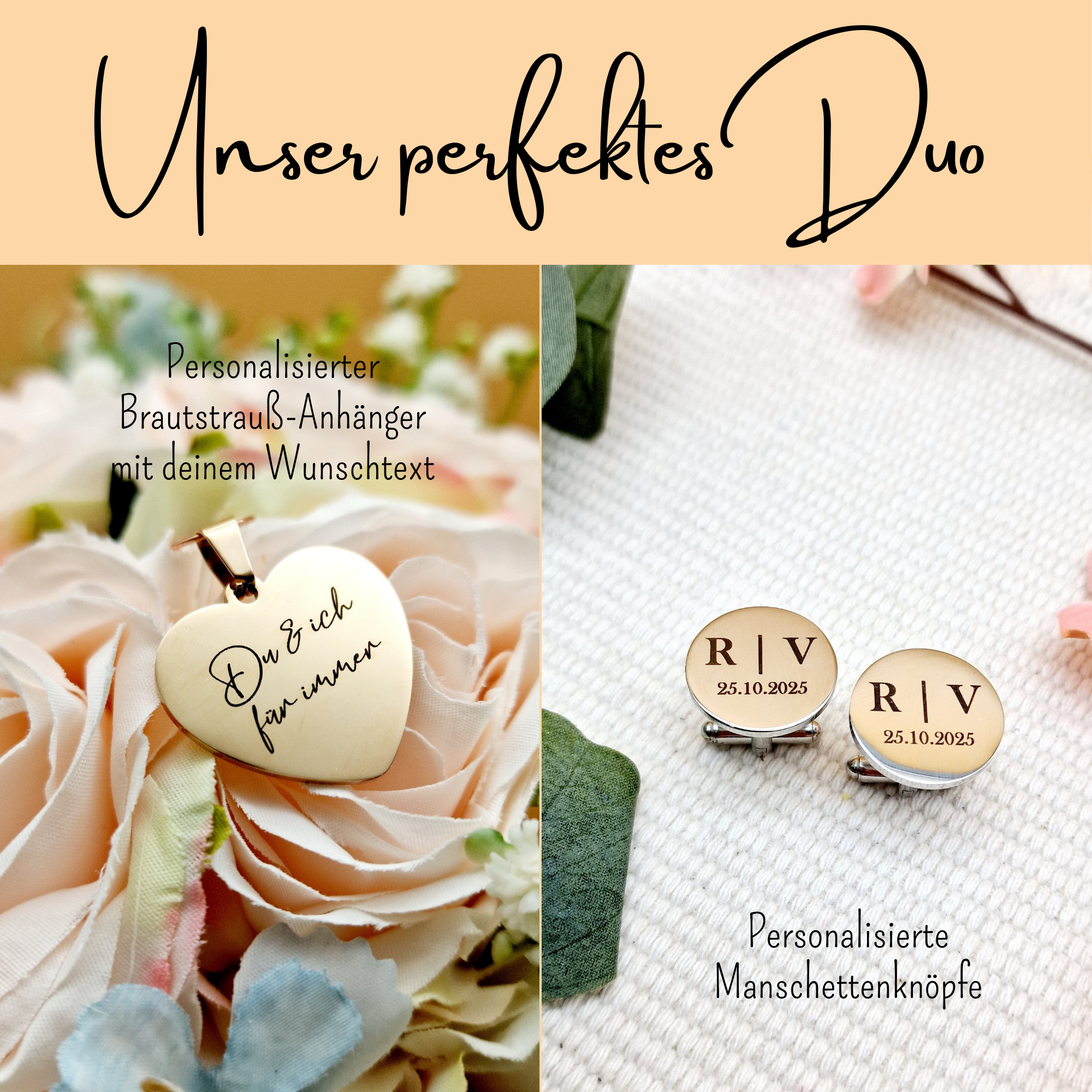Der Anhänger schmückt den Brautstrauß, die Manschettenknöpfe runden das Outfit vom Bräutigam ab – und zusammen erzählen sie eure ganz persönliche Liebesgeschichte. Ein Set, das euch nicht nur am Hochzeitstag begleitet, sondern für immer an diesen besonderen Tag erinnert.