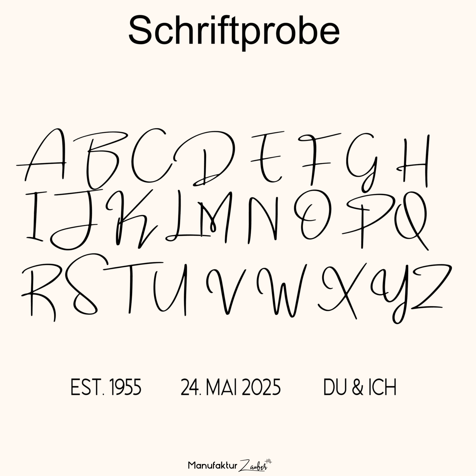 Jedes Paar wird mit zwei Initialen in eleganter Schreibschrift graviert. Auf Wunsch kann zusätzlich ein Datum ergänzt werden – das Hochzeitsdatum, ein Jahrestag oder ein anderes besonderes Ereignis, das für immer in Erinnerung bleiben soll, oder ein kurzes Wort wie Bräutigam, Trauzeuge oder Brautvater