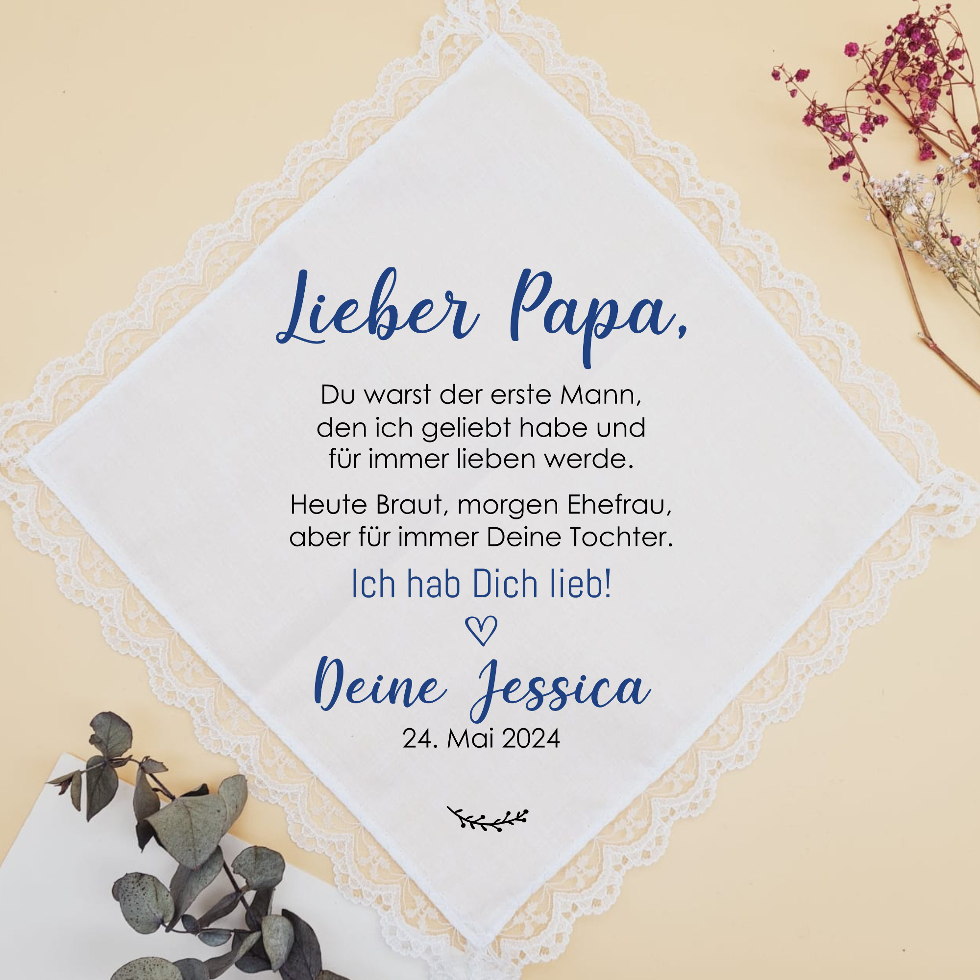 Auch für den Brautpapa ist es ein ganz besonderer und emotionaler Schritt, wenn er seine Tochter an ihren zukünftigen Mann übergibt. Mit diesem einmaligen Taschentuch kannst du deinem Papa nochmal sagen, wie sehr du ihn liebst und immer lieben wirst. Da fließen garantiert schon die ersten Freudentränen vor dem großen Ja-Wort.