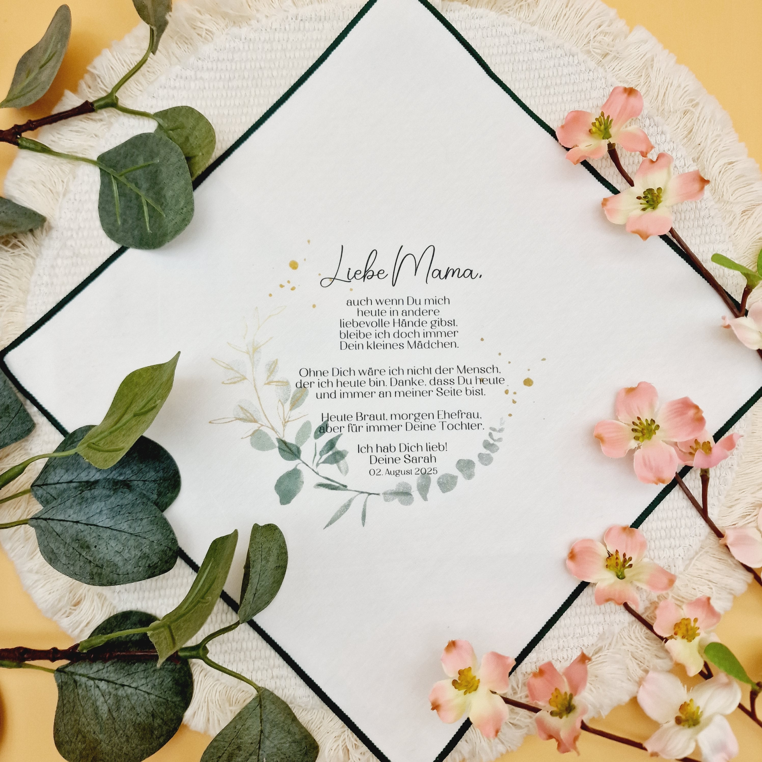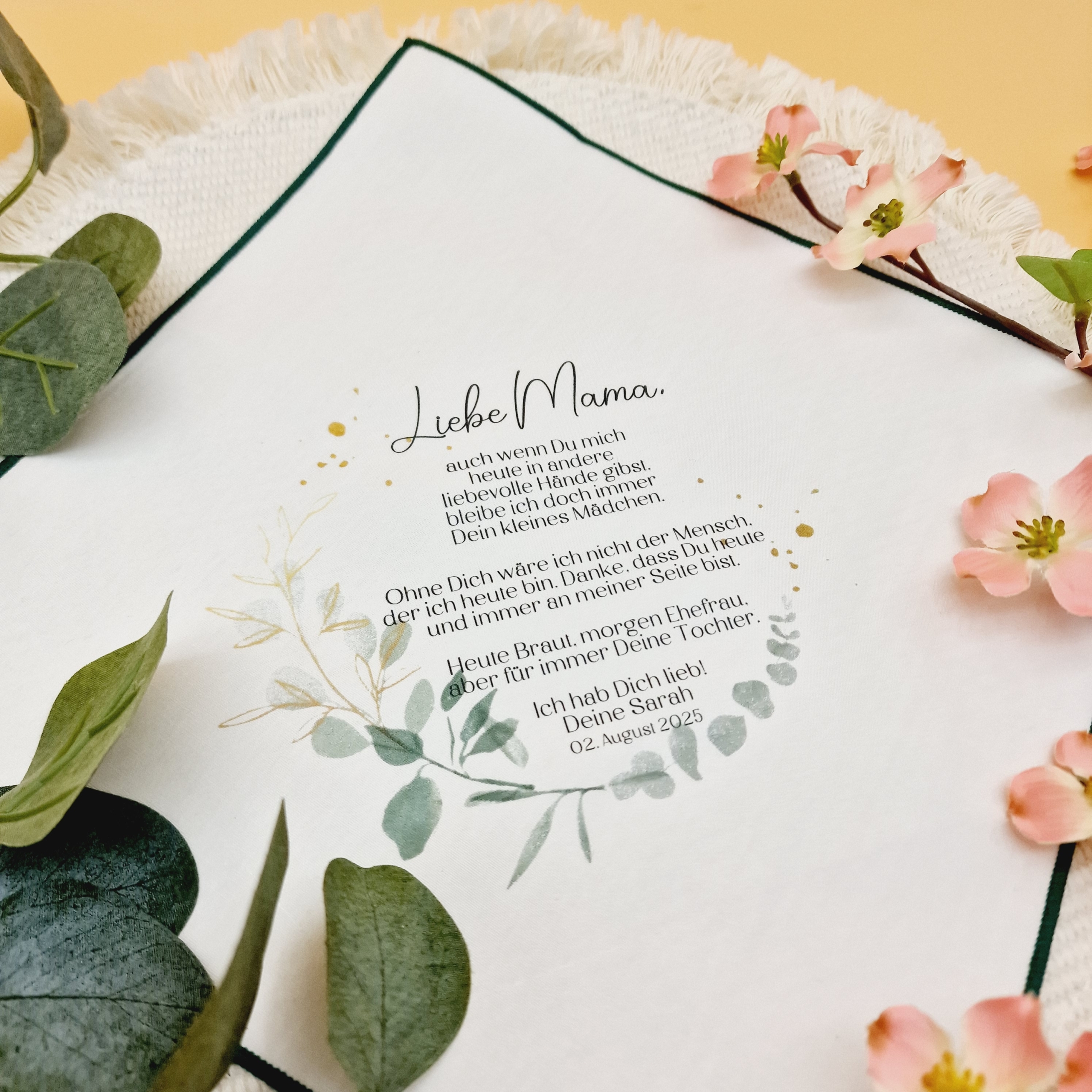 Dieses liebevoll gestaltete Taschentuch im zarten Eukalyptus-Design ist das perfekte Geschenk für Mama, Papa, Oma oder Opa – als persönliche Erinnerung an einen der schönsten Tage eures Lebens. Es begleitet sie durch all die emotionalen Momente der Hochzeit: wenn Tränen der Freude fließen, das Herz vor Stolz klopft und die Liebe in der Luft liegt.
