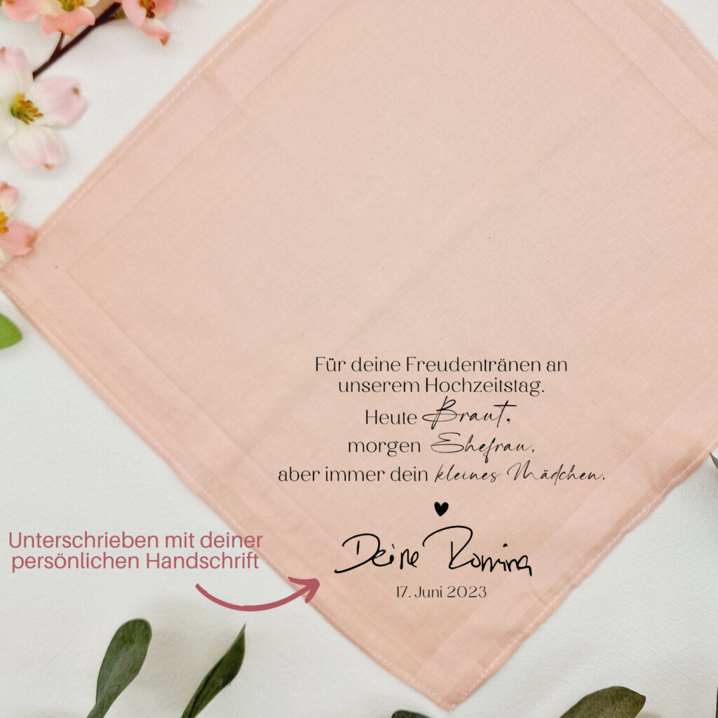 Dieses personalisierte Stofftaschentuch auf Wunsch mit eigener Unterschrift „Braut, Ehefrau, Tochter“ ist ein ganz besonderes und zutiefst emotionales Geschenk für deine Eltern an deinem Hochzeitstag.
