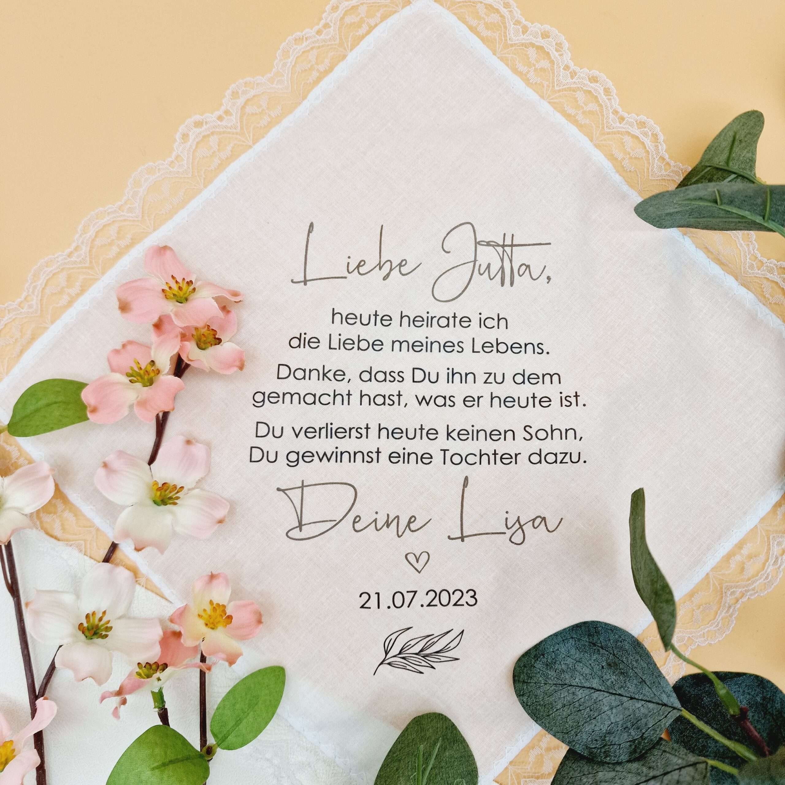 Möchtest du deiner Schwiegermama oder auch deinem Schwiegerpapa auf einer ganz besonderen Weise an deinem Hochzeitstag Danke sagen? Dann ist dieses personalisierte Stofftaschentuch „Schwiegermama“ perfekt für dich. Mit diesem liebevollen Text rührst du deine Schwiegereltern in Spe garantiert vor dem großen Ja-Wort schon zu Tränen.