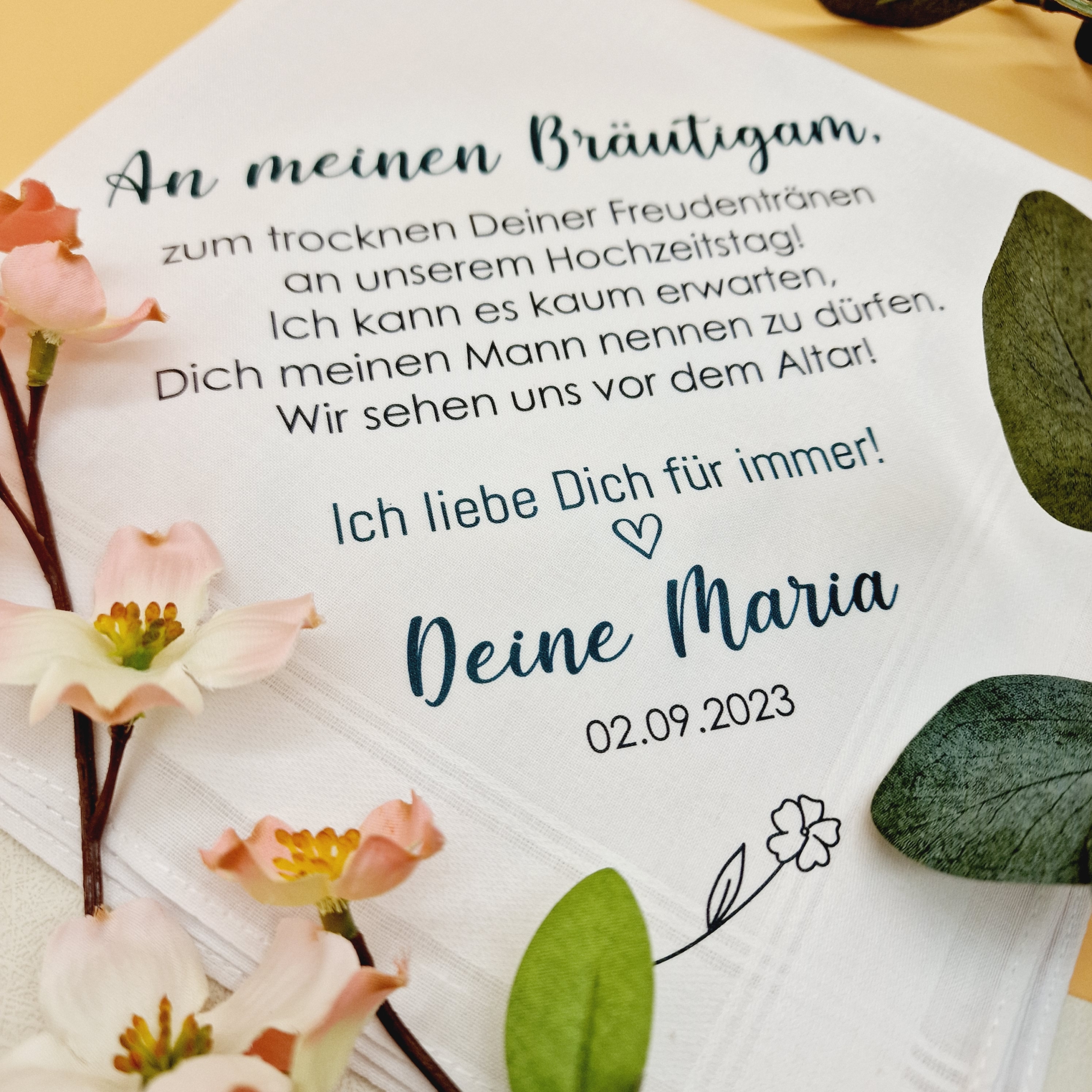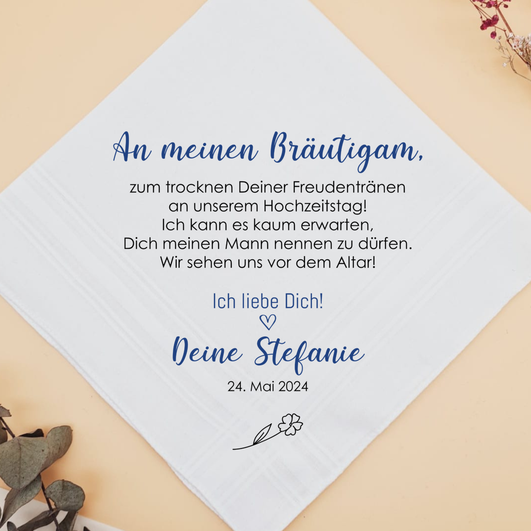 - Personalisiere das Stofftaschentuch vom Braut an die Bräutigam mit deinen persönlichen Daten