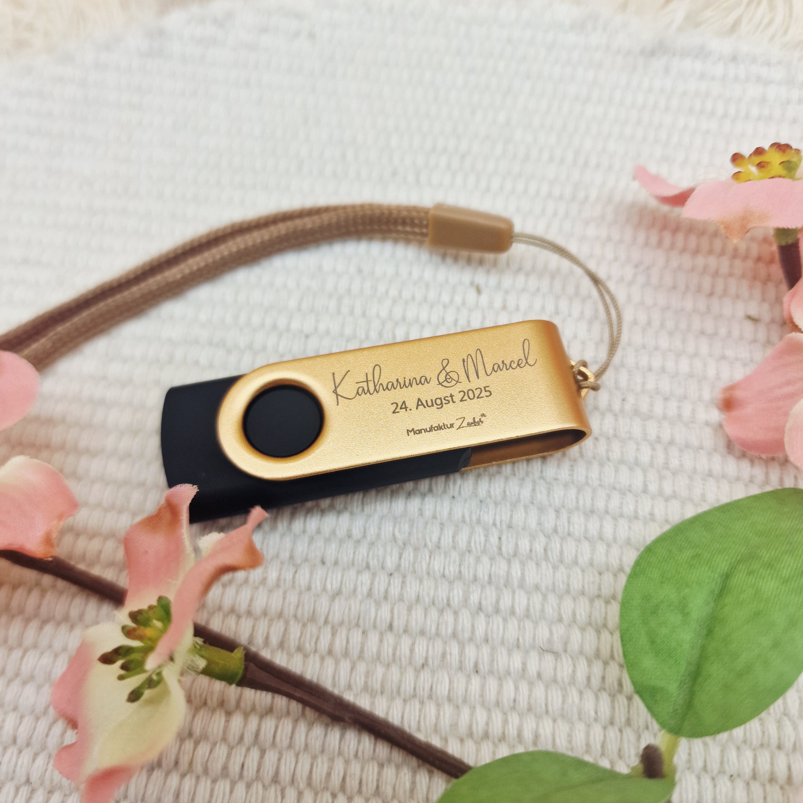 Der goldene Drehverschluss sieht nicht nur edel aus, sondern schützt die Daten zuverlässig. Perfekt für Brautpaare, Trauzeugen oder Dienstleister, die Erinnerungen stilvoll übergeben möchten.
